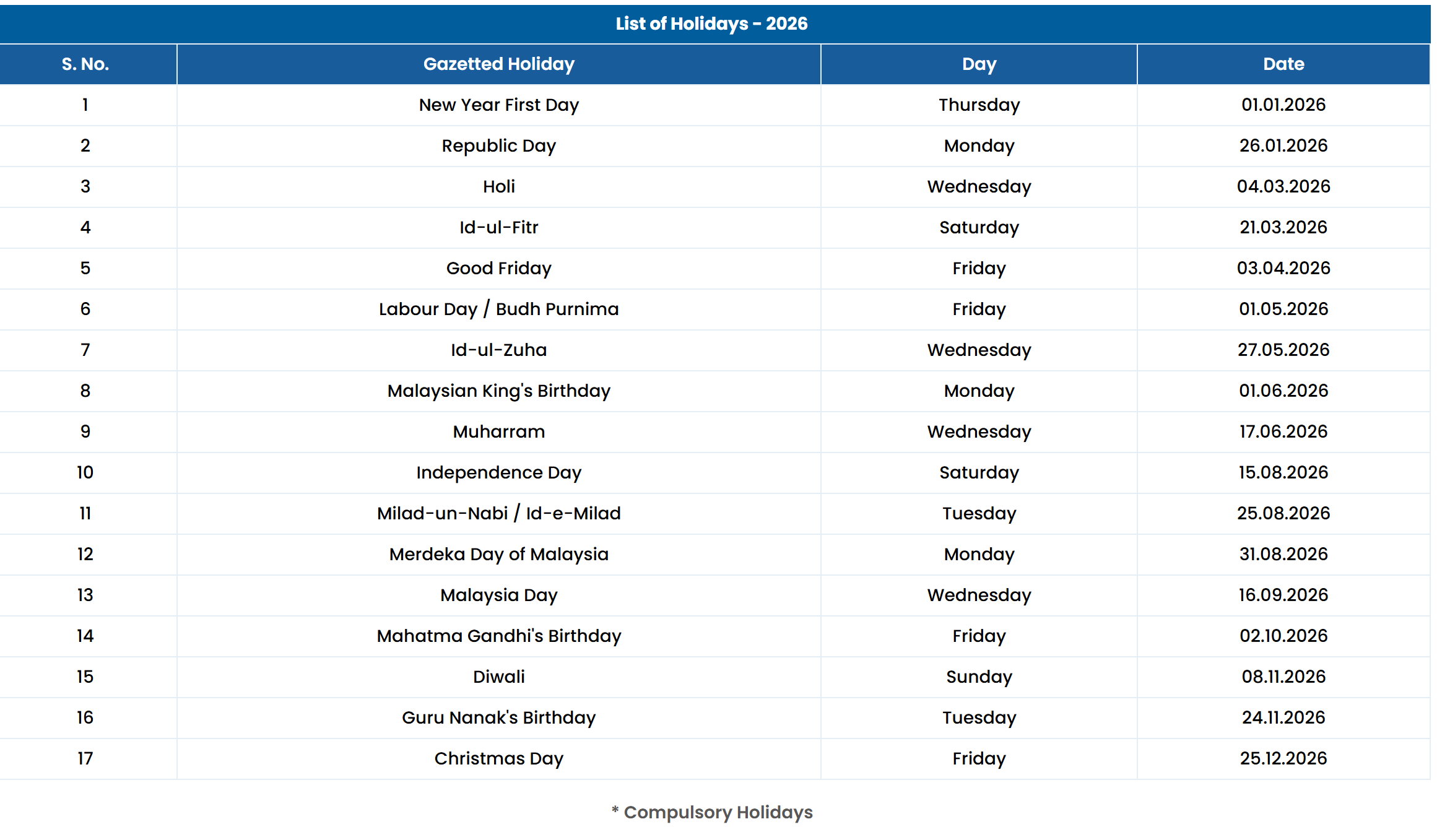 List Of Holidays